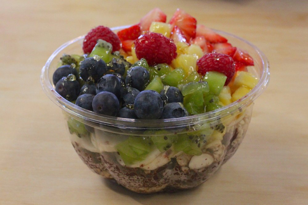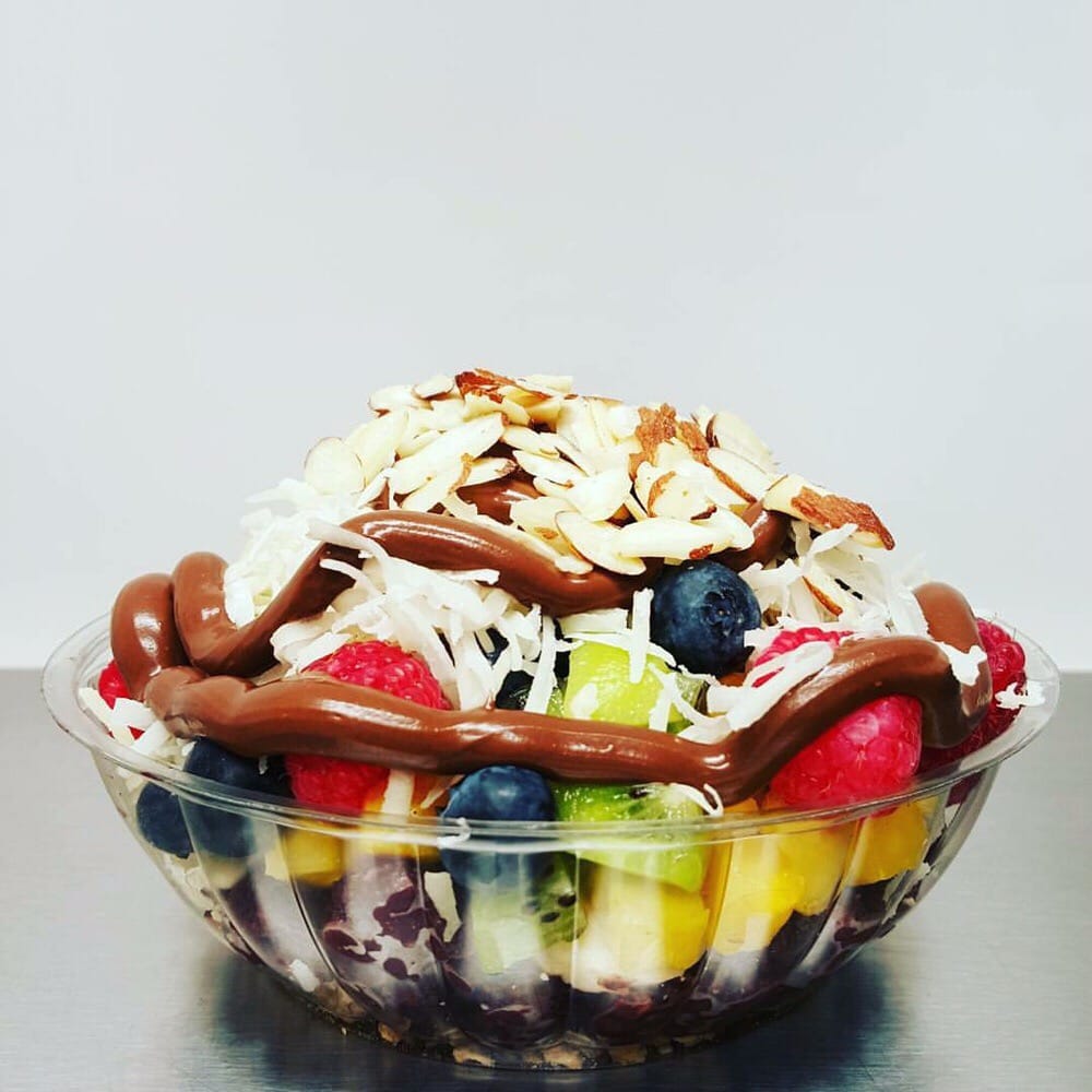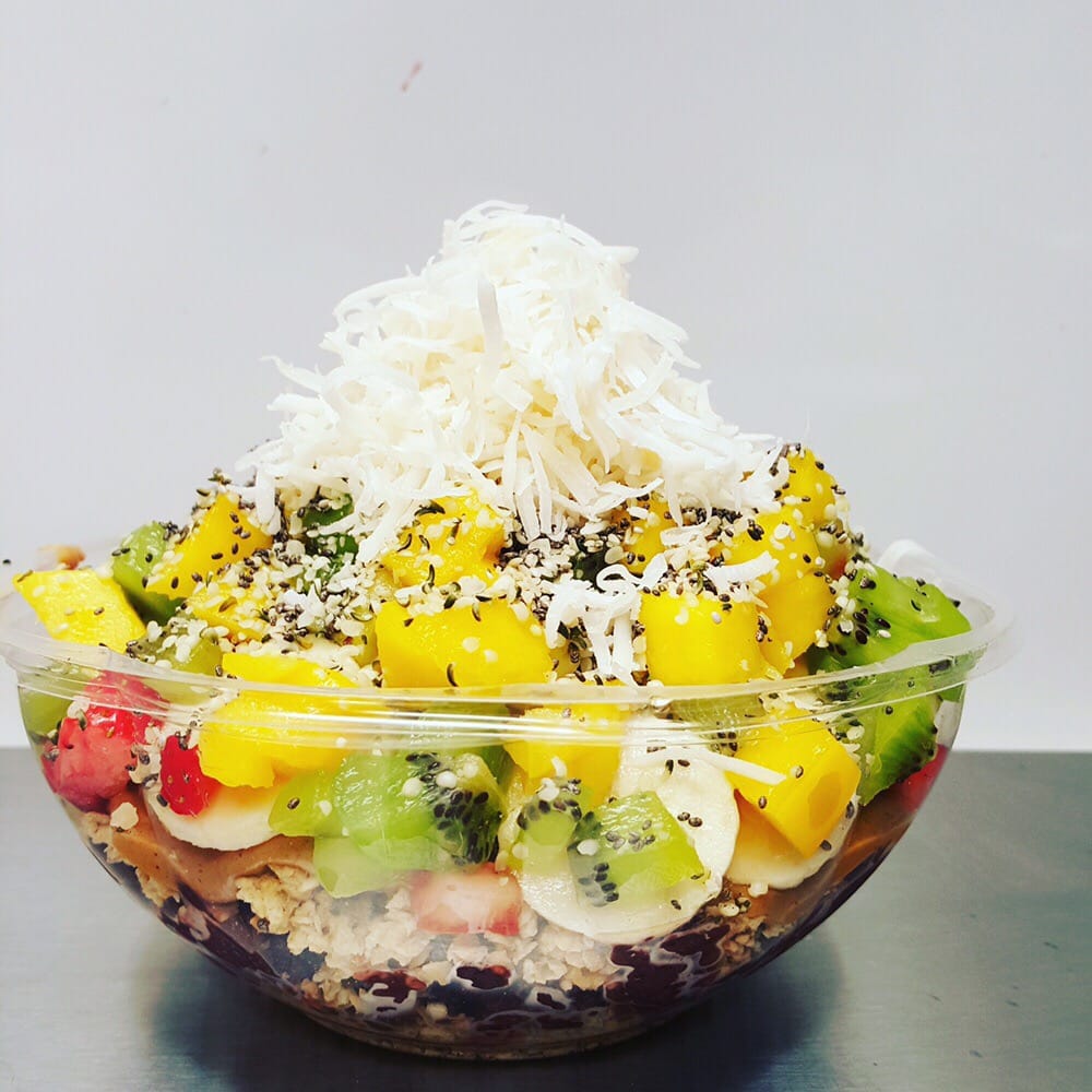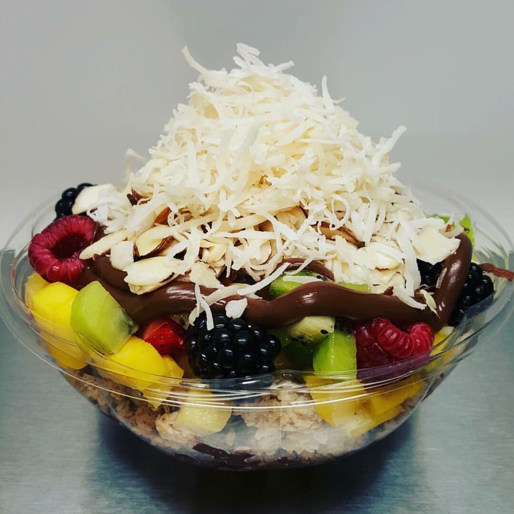 Granola, acai puree, banana, pineapple, strawberry, kiwi, blueberry, mango, and raspberry